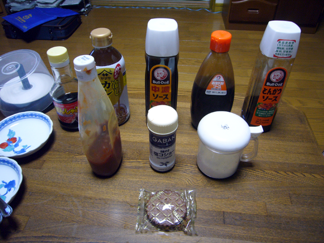 上の段:右からとんかつソース、お好みソース、中濃ソース、冷やしカレーうどん、ぽんしゃぶのたれ