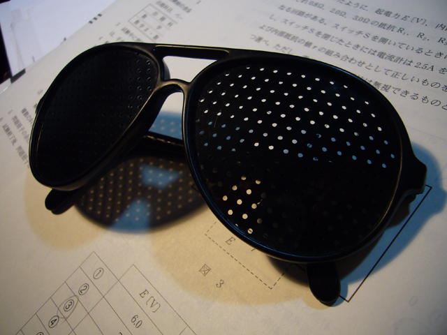 簡単に言うと、メガネのレンズにあたる部分にポツポツと小さい穴がたくさんあり、それを通してみると眼が休まるメガネです。